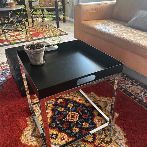 Solidt sofabord, b: 60 l: 120 h: 38, Sort / krom sofabord med 3 aftagelige og vendbare sorte bakker. Pris: 260,-kr.