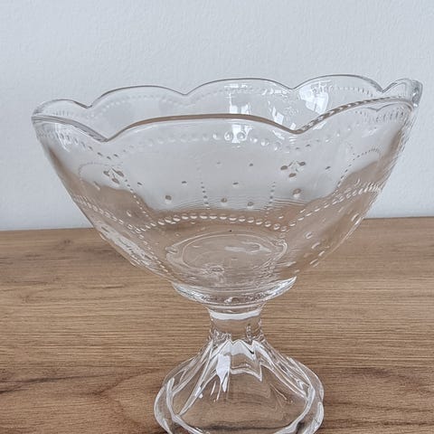 Skål på fod, Presset glas, Skål på fod i presset glas med fint mønsterpræg. H=17,5 cm. D= 22 cm (målt foroven). Ideel til frugt, servering eller bare til pynt. Kan sendes, men mere sikkert med afhentning