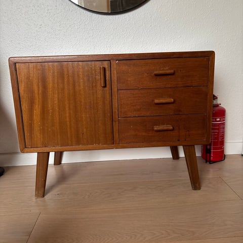 Skænk, fyrretræ, b: 61 d: 40 h: 63, Rigtig fin gammel skænk/tv-bord/kommode/servante, som er fra 60'erne-70'erne og er blevet malet i skønne sommerfarver og med gyldne knop-greb.