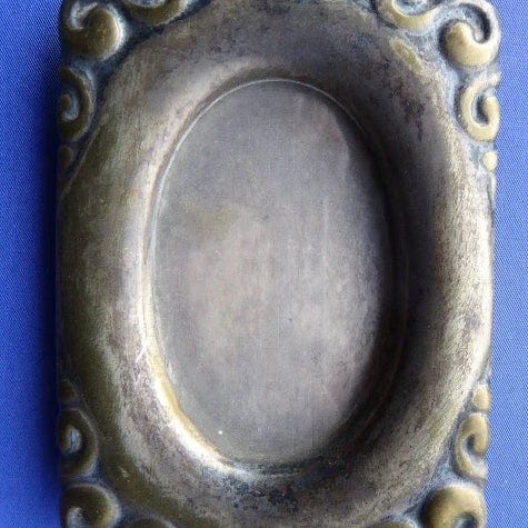 fra beg. af 1900tal - 88x118mm . med glas, udklappelig støttefod på bagside så den kan stå - på støttefoden stemplet med 2 tårne = plet og HF = formentligt H. Fischer virksom 1893 - 1937 i København - m. patina