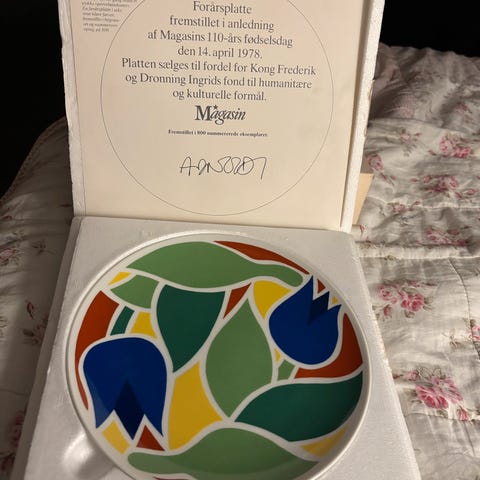 Per Arnoldi kunst på Magasins forårsplatte fra 1978 er lavet i anledning af Magasins, 110års fødselsdag d.14 april 1978