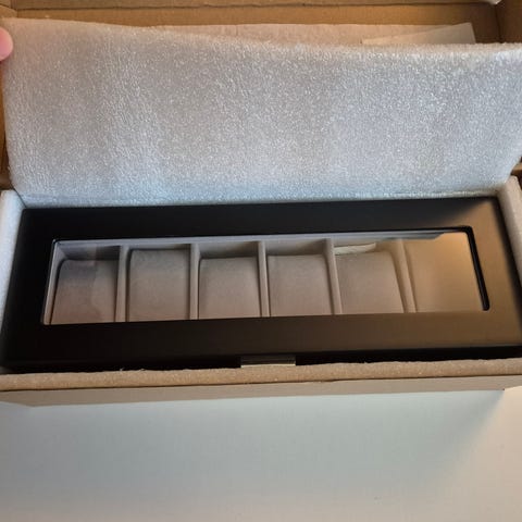 Andet, andet mærke, Ditur urboks til 6 ure, sort imiteret carbon. Eksklusiv og stilfuld urboks til opbevaring af i alt 6 armbåndsure. Urboksen er udført i et carbon look med sort interiør. Urboksen har plads til 6 ure og er velegnet til at beskytte og udstille dine ure, når du ikke selv har dem på håndleddet. Urboksen er produceret med ægte glas. Nypris kr. 599. Fremstår som ny