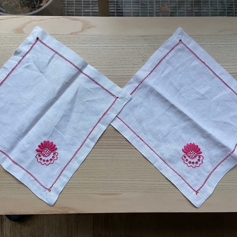 Stofservietter, Retro stofservietter i Provence-stil. Rød grundfarve med gule og blå detaljer.