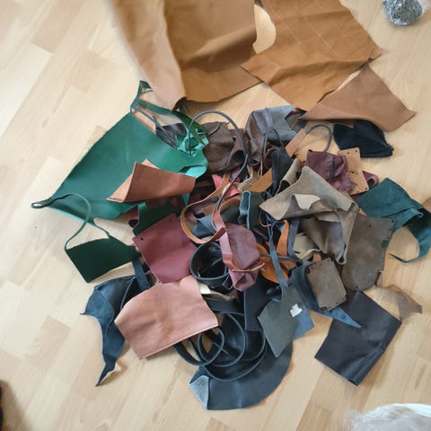 Blandede hobbyartikler, Læderrester, Rester af møbellæder. Sort. Pæne store stykker ind i mellem.
