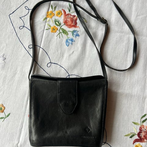 Skuldertaske, andet mærke, lammeskind, Fin let og rummelig skuldertaske i sort skind som lukkes med lynlås og i begge sider er der lynlåse til små rum fx. Nøgler .