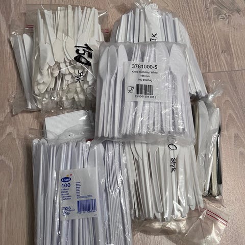 125 stk. engangs dessertskeer, nye, i klar plast fra Duni. Rigtig god kvalitet der tåler opvask. 2 pakke á 50 stk. Pris kr. 70,- for pr. pk. og kr. 35,- for den halve pakke med 25 stk