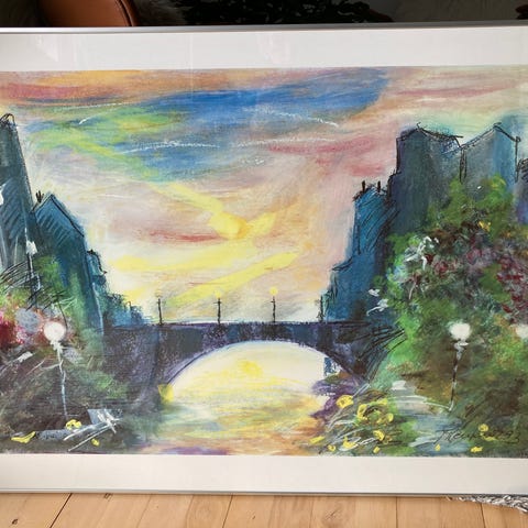 Kunsttryk af bymalue i ramme. Har aldrig været oppe og hænge og folie sidder stadig på “glasset”.