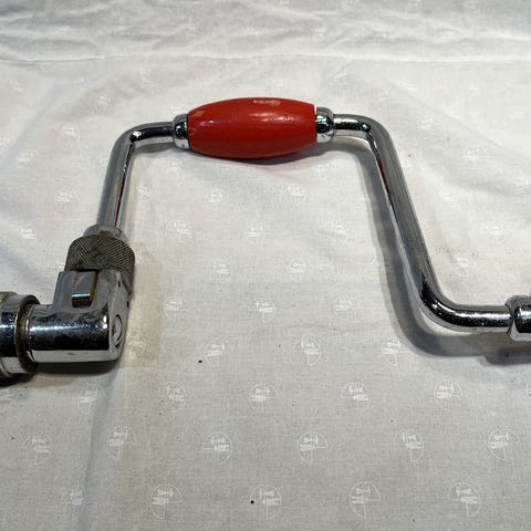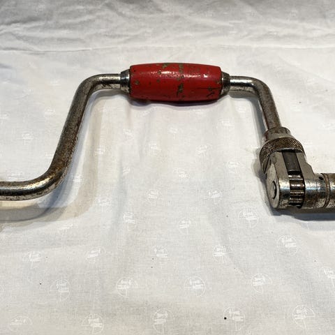 Det store håndbor kaldes en brystboremaskine, fordi man selv med kroppens vægt skal levere det tryk, der skal til.