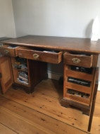 Skrivebord, 100 år gl., b: 132 d: 61 h: 77, Skrivebord ca. anno 1920. Bordplade i eg. Skuffer og kabinetter i fyr.