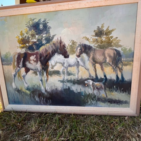 malet på træ, Poul Gerlac, motiv: heste, b: 47 h: 32, det drejer sig om 3 hestebilleder fra 1983 af for mig ulæselig signatur, jeg indsætter billeder af signaturen på alle 3, størrelsen er på det største af de 3, de er alle flotte og i god stand og hestene hedder Micro, Cherri og Chock, prisen er samlet