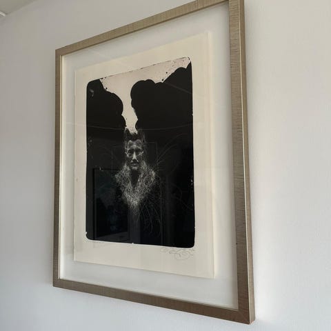 Litografi , Kasper Eistrup, motiv: Volcanologist III, b: 38 h: 50, 36/40 fra 2012, 3. kunstværk i triologien Volcanologist. Rammen er lidt større end de angivede mål. Vær opmærksom på genskin i glasset, der forvrænger farverne lidt.
