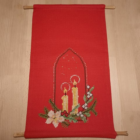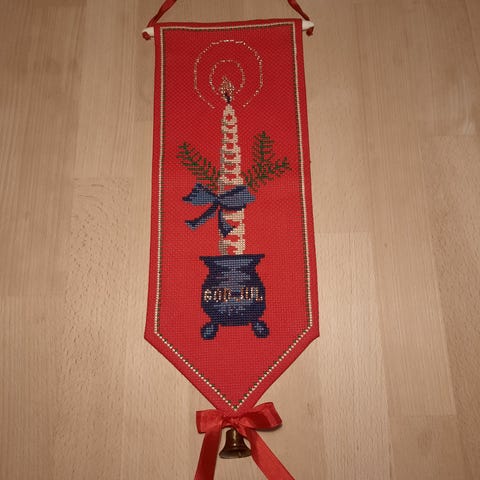 Fint ældre vægophæng med broderet julemotiv med kirke og huse med tekst "God jul". Hæklet ophængssnor.