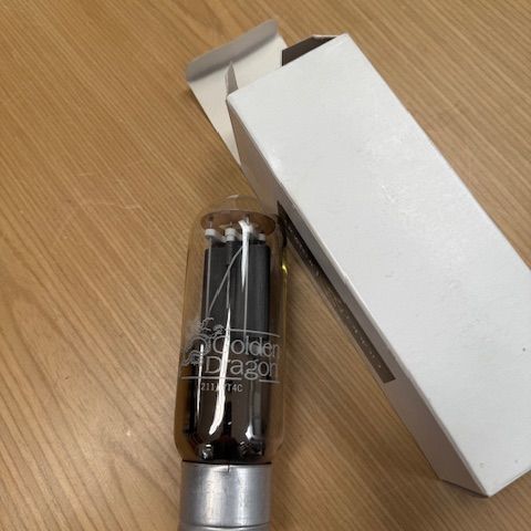 Golden Dragon E34 elektroniske rør til brug i lydudstyr. Pakken indeholder flere rør samt tilhørende emballage fra mærker som Golden Dragon og Chelmer Valve. Priser fra 200 kr