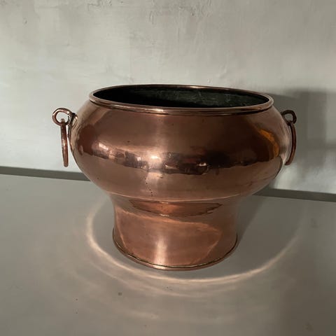 Beholder/spand, Gammel varmebækken eller beholder med låg i bronze / kobber. Har patina og smukke grønne plamager fra vand.