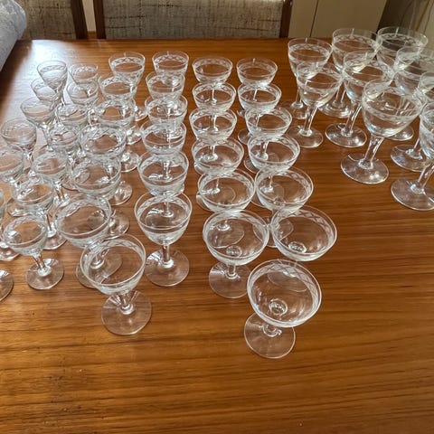 Glas, Vinglas, Ejby Holmegård, Hvidvin pris 35kr pr stk, 64 hedvin 20kr pr stk ,6 likør 45kr pr stk, 23 snaps 15kr pr stk, eller det hele for 2000kr
