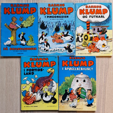 Rasmus Klump nr 1 + 2 + 3, Carla og Vilh. Hansen, De 3 første Rasmus Klump hæfter. Af Carla og Vilhelm Hansen. Billedbøger. Forlaget Carlsen, 2014. Helt nye eksemplarer