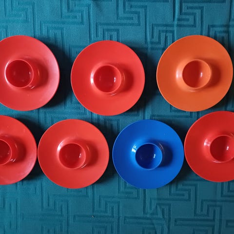 Andet, Æggebægre, ROSTI, Fine RETRO æggebægre ( 1 gul, 2 vårgrønne, 2 karry gule ) Mærke ROSTI. Fra ikke ryger hjem. Pæn stand uden afslag og revner.