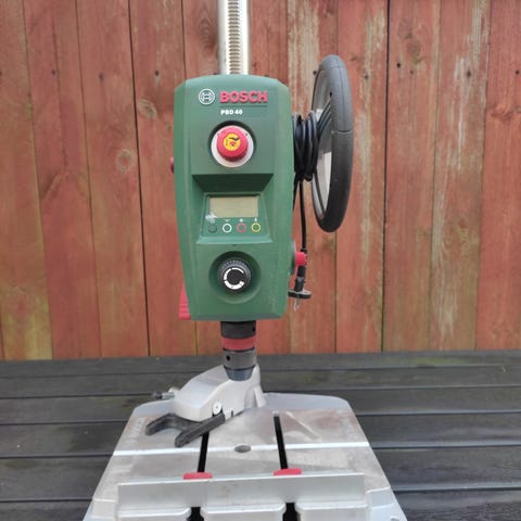 Bosch GBH 2-20 DRE boremaskine med blå og sort design. Inkluderer ekstra håndtag og borstativ. Maskinen er egnet til boring og lette mejslingsopgaver. Leveres i kuffert til opbevaring og transport.