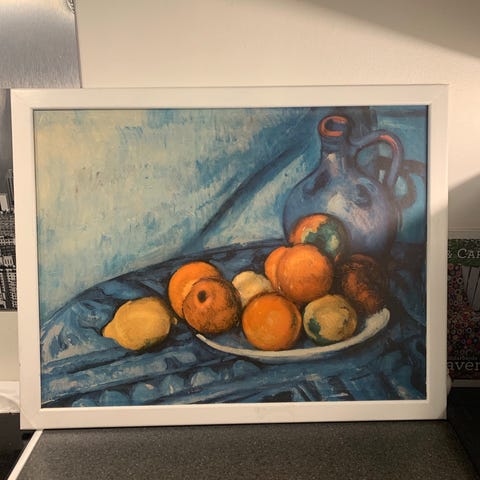 Billede af frugtfad, ren nostalgi. Billede i ramme 126*61 cm med motiv af frugter og blomster á la den sidste nadver. Fra ikke ryger hjem. God og intakt stand.