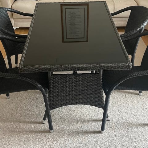 Havemøbelsæt, Risveden, Stål og hærdet glas, Bordet er lidt ustabilt. Den sidste stol ligger i vores kælder. Sælges pga pladsmangel. Som ny
