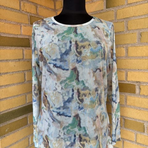 Bluse, Kaffe curve, str. 44, Multi, Næsten som ny, Kaffe Curve kcRikke Blouse er en helt let chiffon bluse med blomstret print og stribet mønster i stoffet med lille guldtråd i. Båd udskæring i halsen med lille slids og knap over i ryggen, små læg ved skulder og korte ærmer med smock elastik ved albuen. Den er svagt transparent