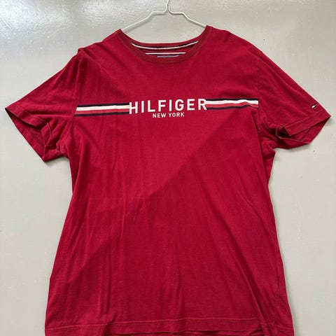 Tommy Hilfiger herre T-shirt i rød farve, størrelse L. Lavet af 100% bomuld, hvilket gør den behagelig og åndbar. Ideel til hverdagsbrug.