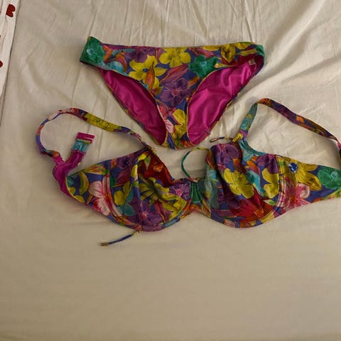 Vatteret bikinioverdel med variationsmuligheder på stropperne - de kan krydses bagpå og de kan sættes sammen til halterneck.