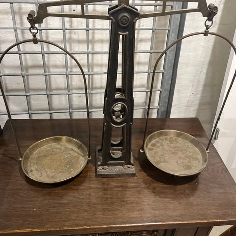 Apotekervægt/købmandsvægt, Metal, Apotekervægt/købmandsvægt med flere lodder fra 5kg og nedefter, jf billede.