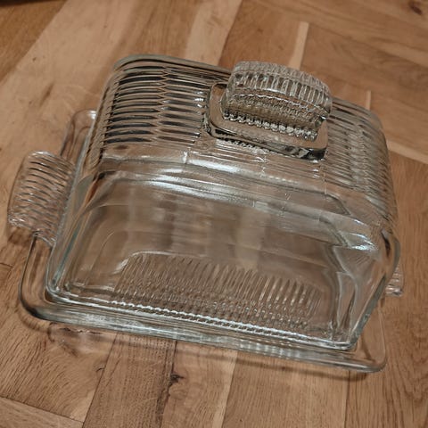 Fin gammel osteklokke af glas / smørskjuler / glasklokke / glaskuppel / smørklokke / glas display. H: 15,5 cm Ø: 13,5cm