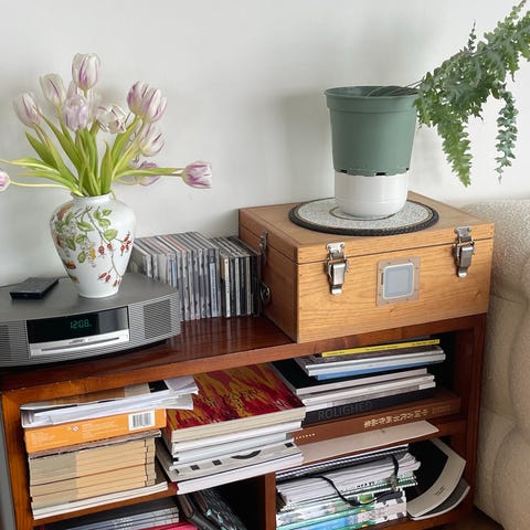 Reol, b: 38 d: 33 h: 109, Egentlig reoler til vinyl'er, men som I kan se, passer Ikea-kasser også!