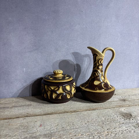 Keramik, Kande., Michael Andersen/Bornholm, Meget flot lille kande med slidmærker på hanken samt minimal afslag i bunden. Keramiker Michael Andersen (1859-1931). Rønnes byvåben i bunden.