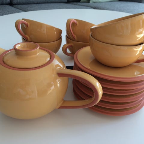 The-sæt i keramik. Sættet består af 6 stk. kopper, 6. stk. underkopper og 1. stk. tekande. Farven er dyb blå med kontrastdetaljer. Perfekt til servering af the i et stilfuldt design.