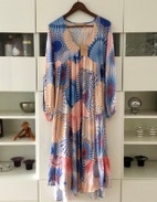 Den skønne kjole er lavet i et smukt mønster i blå lyseblå gul fersken koral mm.