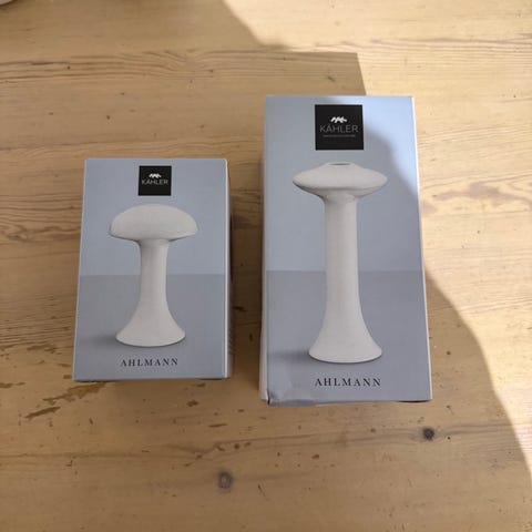 Lysestager, Kahler, Disse 4 avvento lysestager er i forskellige grå nuancer. De er designet af Marianne Nielsen. Har kun været brugt en enkelt gang.