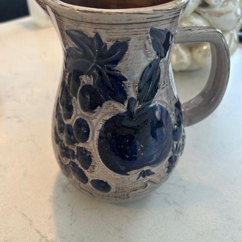 Aldersrelaterede spor, krakeleringer og mini boble i glasuren samt medfødt hak ved topkanten, lavet før glasuren kom på (se billederne).