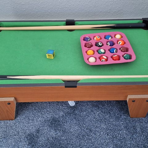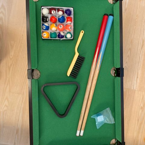 Helt nyt og ubrugt "billardbord samlesæt" ellere rettere poolbord samlesæt (da det ikke er med kegler). Udstyret med 15 farverige kugler, to køstikker, et kuglestativ og et filtforet bord. Det kommer fra et røgfrit hjem. Pris: 100 kr.