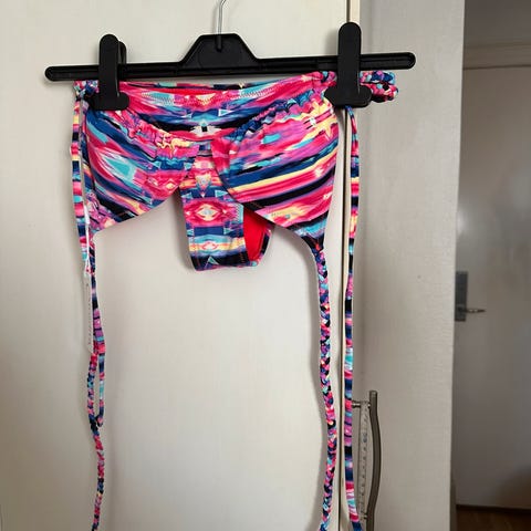 Bikinioverdelen har en smuk drapering og en dekorativ guldring i midten. Bikinioverdelen har brede regulerbare skulderstropper med en enkel lukning på ryggen.
