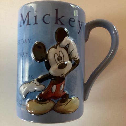 Pænt Disney krus med Mickey og Minnie med en anelse brugsslid ved Mickeys hånd. Staffordshire Kiln craft.