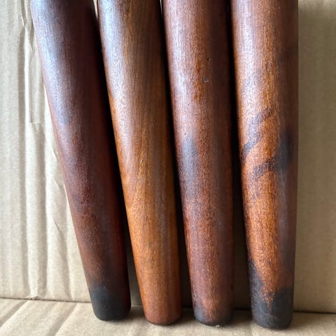 De har været brugt som Front ben og andre 2 træ klodser bagerst mod væg - og kan jo deles på midten så du får 4 ben på ca H: 11 x Ø: 4 cm