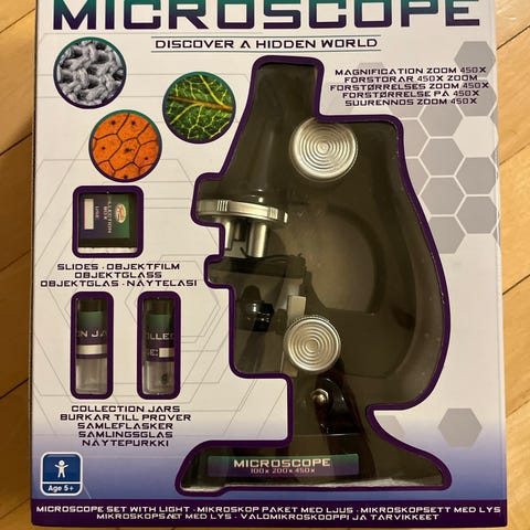 Til helt små børn. Forstørrer op til 8 gange. Robust. Med lys og knap, så mikroskopet kan skrues op og ned.