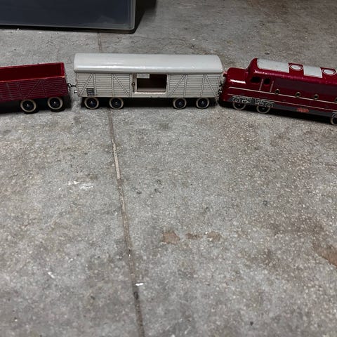 Fint lille farvet tog, vistnok fra 1970’erne, med lokomotiv og fire togvogne. Fra firmaet Gebr. Hildner.
