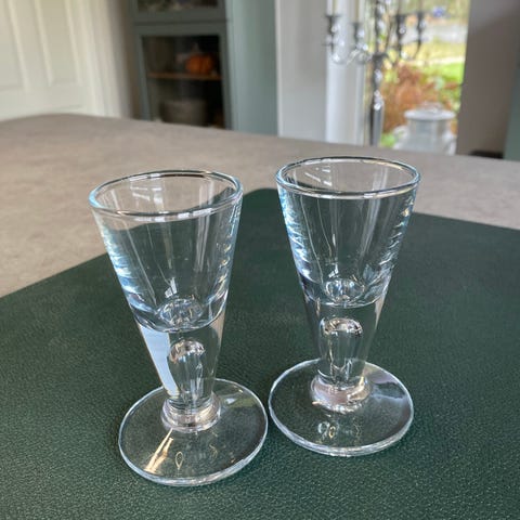 Holmegaard Nøgen Jomfru, 6 stk til Snaps / Dram / Portvin mv., Hø. 11,5 cm, indgraveret med LB i gotisk skrift, brugt 1-2 gange, sælges pr. stk.