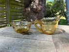Glas, Sukker pg fløde sæt, Gult / ravfarvet glas sukker og fløde sæt. 4,5 cm høj og 11 cm i dia - 7,5 cm høj og 12,5 x 9 cm