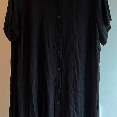 Flot tunika skjorte med almindelig skjortekrave, har 3/4 lange ærmer med manchet og knaplukning samt slids i hver side. Kan både bruges åbentstående og lukket.