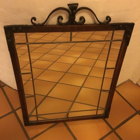 Anden type spejl, b: 62 h: 43, Staldvindue i støbejern, glas udskiftet med spejle (øverste venstre mangler). Øverste midt kan åbnes.