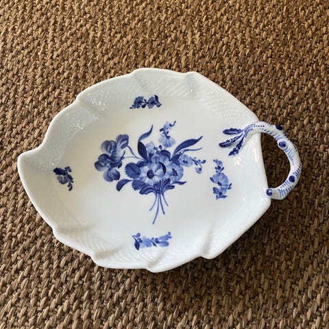 Royal Copenhagen Blå Blomst flettet, blad- formet asiet. Produceret på Den Kgl. Porcelænsfabrik fra 1779. Kopieret fra den tyske Meissen fabrik, men også oprindeligt fra Kina. Efterhånden som man udviklede nye stel-former, blev dekorationen udført på både svejfet, flettet og kantet stel.