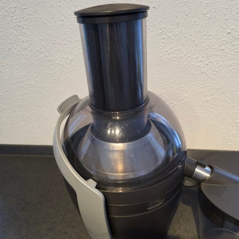 Maskinen kværner frugten, og juice kommer ud i tilhørende kande.