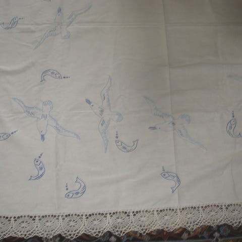DUGEN HAR EN HÅNDSYET SØMKANT, UDEN BLONDE, DER HENVISER TIL TIDSPUNKT - OMKRING MIDT ÅR 19-TREDIVERNE, HVOR FUNKIS PERIODEN SLOG IGENNEM MED DET ENKLE DESIGN. (BL.A. DESIGNER/ARKITEKT ARNE JACOBSEN.)
