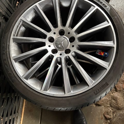 Alufælge, 19", Mercedes, 285 / 35 / R19, sommerdæk, Continental, 95% mønster, fælge med dæk, Super flotte AMG fælge. De første 4 billeder er efter hurtig vask! Originale AMG fælge fra vores Mercedes W218 CLS 350 årgang 2015, monteret med 19” ContiSportContact 5P. 255 på forhjul og 285 på baghjul. Kørt en sæson cirka 6.000 km.. Fælgerne er blank sort lakeret. Dæk og fælge er opbevaret der hvor vi får skiftet fra sommer til vinter hjul, så vi kan arrangere afhentning i Hillerød og Nysted