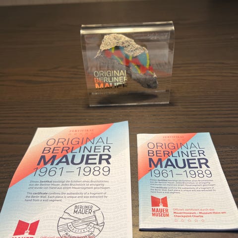 Andre samleobjekter, Berlinmur, Et 10x7 cm stykke af Berlinmuren i plexiglas.